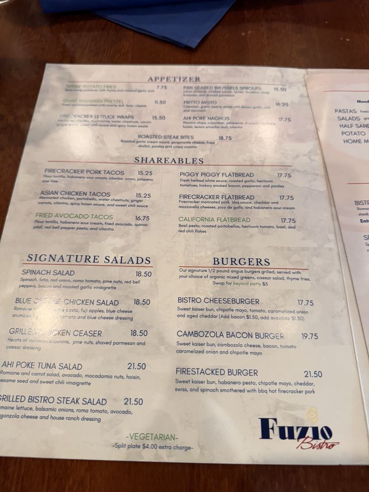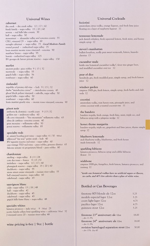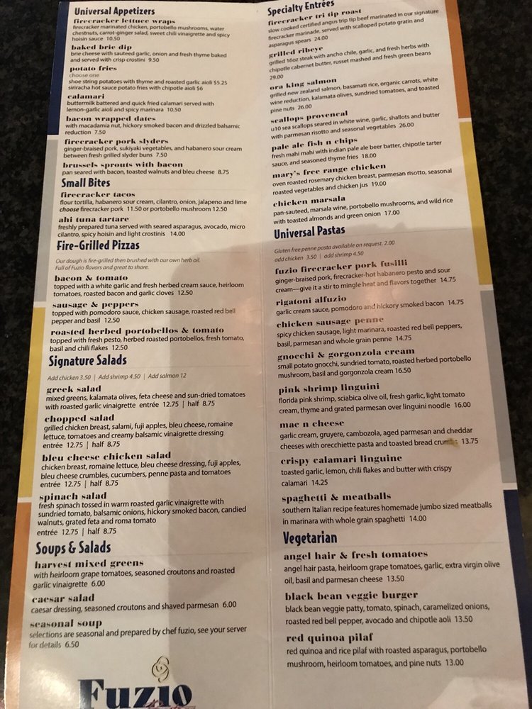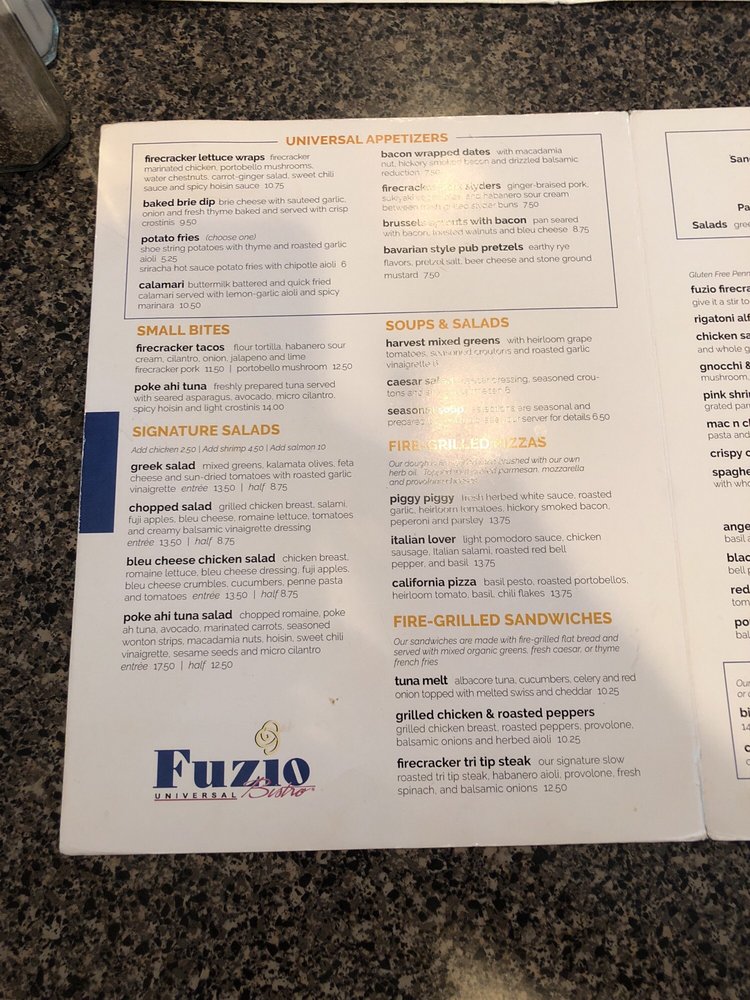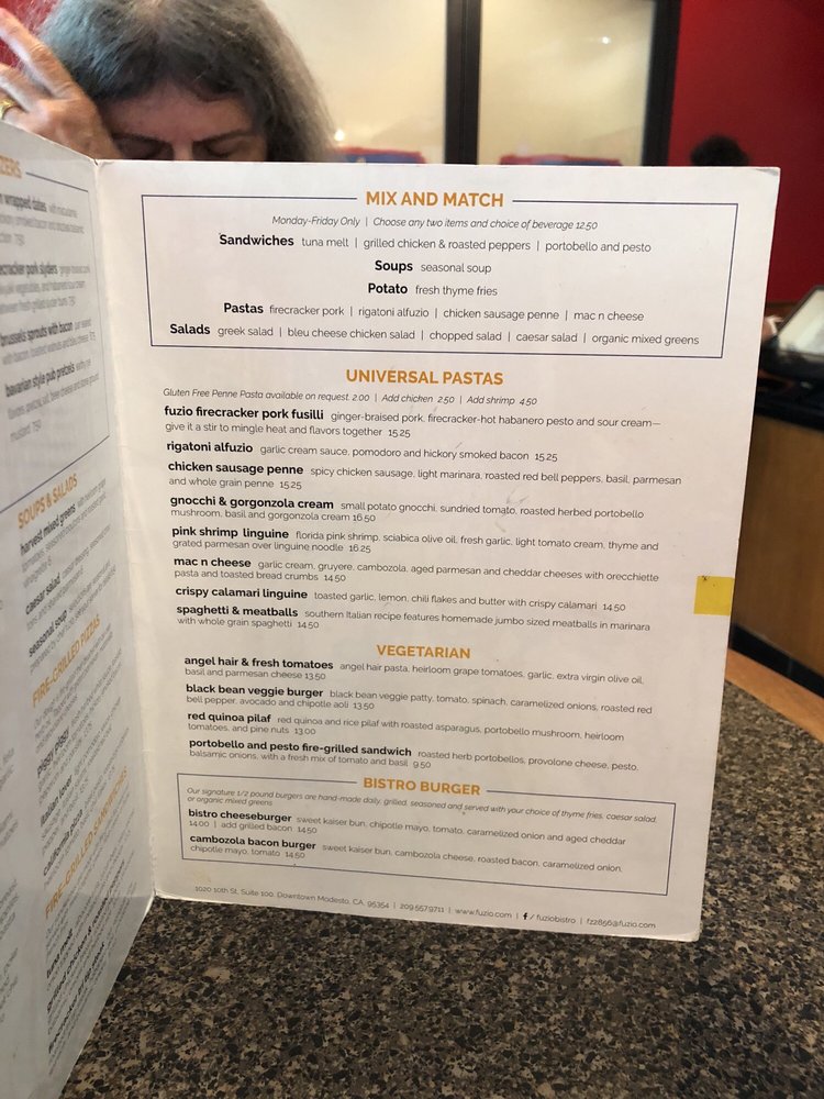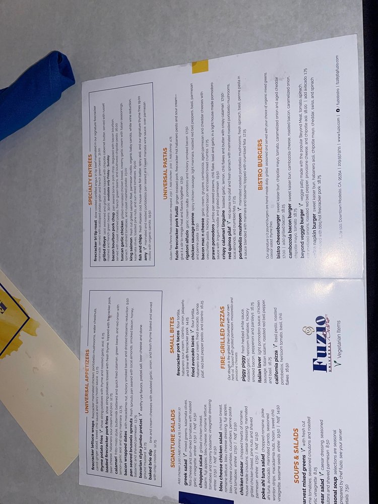Fuzio Universal Bistro, located in Modesto, CA, offers a trendy yet casual dining experience in the New American - Salad category. This versatile establishment caters to various needs, such as reservations, delivery, takeout, and catering services. With a full bar, outdoor seating, and a range of amenities like free Wi-Fi, Fuzio aims to provide a memorable dining experience. Customers praise the attentive service and flavorful dishes, such as the Pork Fusilli and Fresh Catch Seafood. The restaurant's ambiance is described as pleasant, making it a popular spot for gatherings and special occasions. Whether enjoying starters before a movie or hosting a wedding reception, Fuzio Universal Bistro delivers on taste, service, and overall experience.